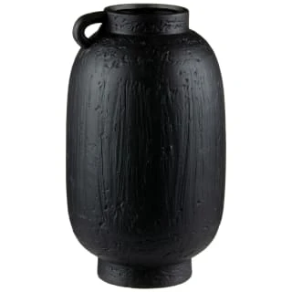 A sleek black ceramic vase crafted into a traditional urn shape, with a mini handle and artificial wear marks.